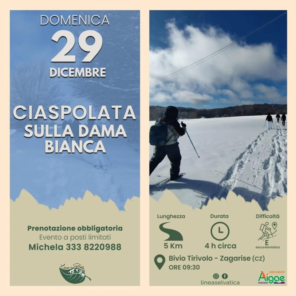 Domenica 29 dicembre 2024 scopri la bellezza incontaminata della Sila con una ciaspolata guidata. Camminerai tra boschi innevati, ammirando panorami mozzafiato.