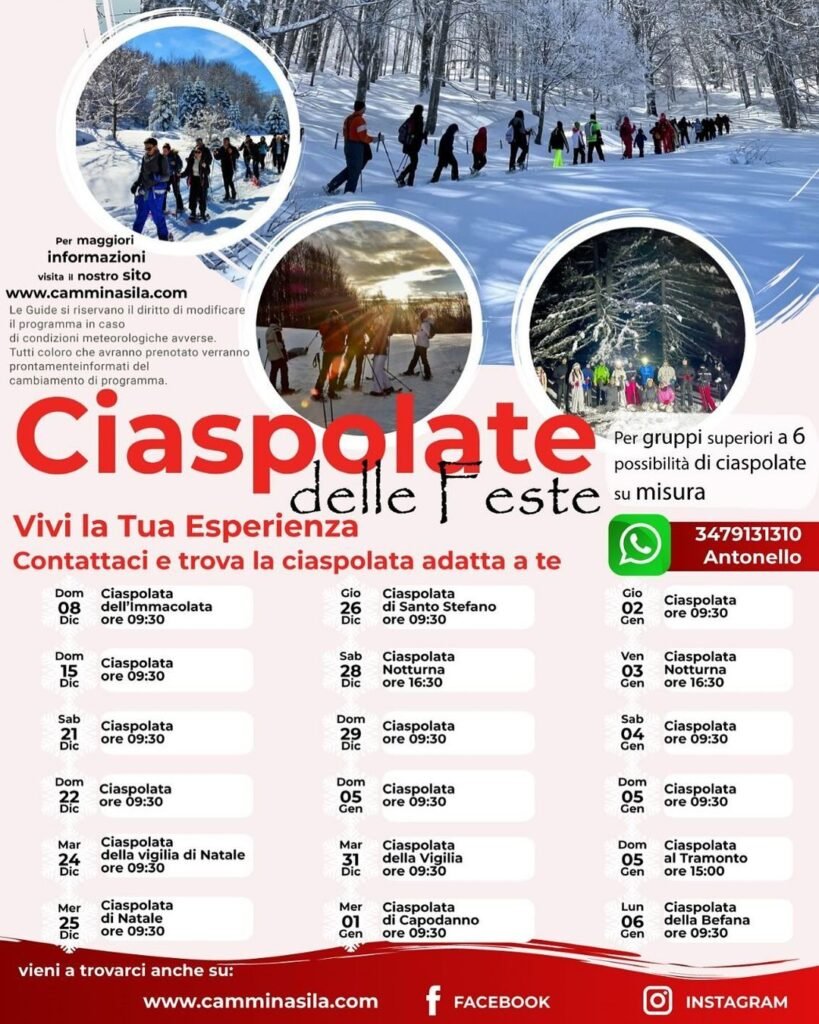 Camminasila organizza una serie di escursioni con le ciaspole durante il periodo natalizio. Ogni domenica, a partire dall'8 dicembre fino al 6 gennaio, verranno proposti itinerari diversi alla scoperta dei sentieri innevati della Sila.