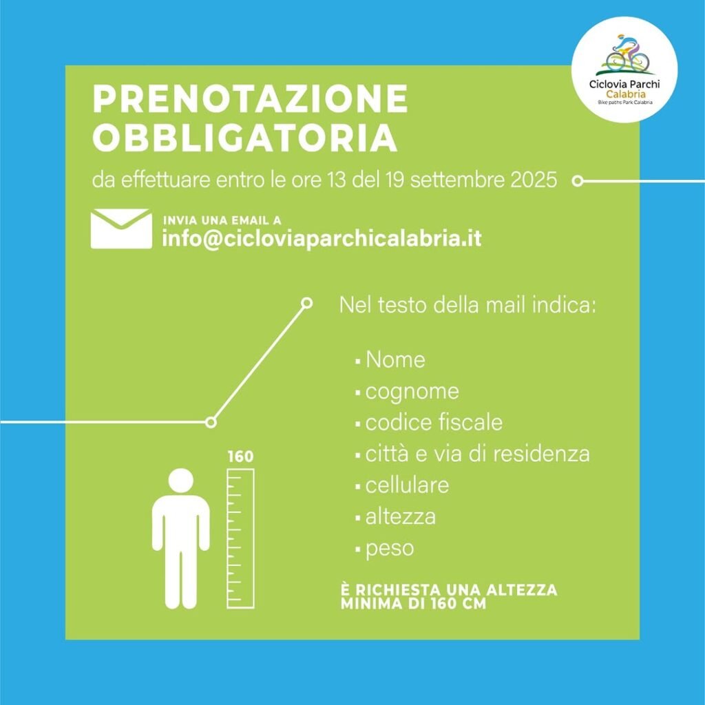 La prenotazione è obbligatoria e deve essere effettuata entro le ore 13:00 del 19 settembre. Nella richiesta è necessario indicare nome, cognome, codice fiscale, città e via di residenza, numero di cellulare, altezza e peso. È richiesta un’altezza minima di 160 cm per l’utilizzo delle bici assistite.