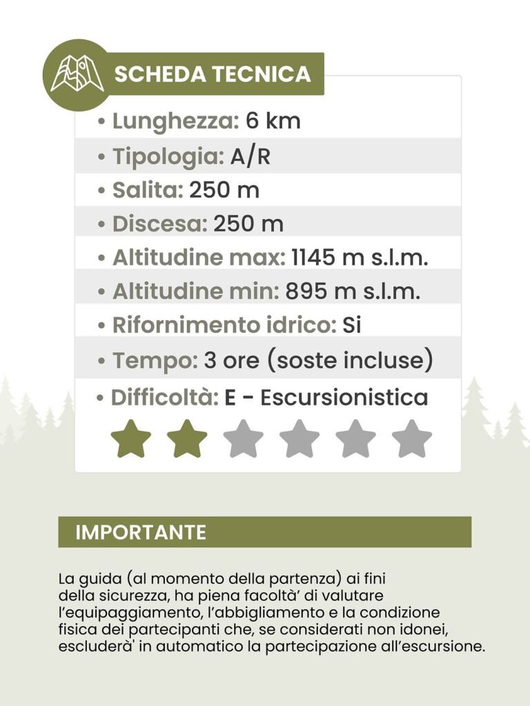 L’escursione è organizzata con posti limitati e richiede l’attrezzatura necessaria per affrontare il cammino in sicurezza, oltre a guinzaglio e pettorina per gli amici a quattro zampe.