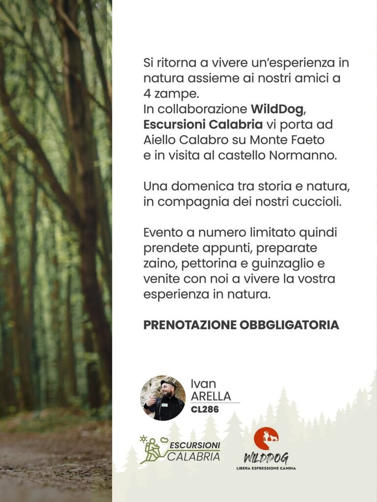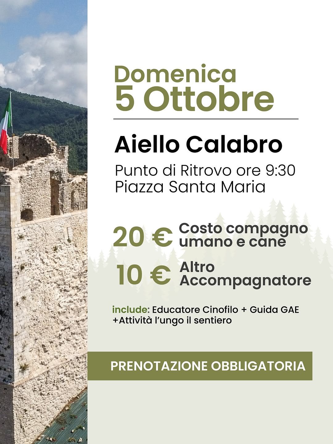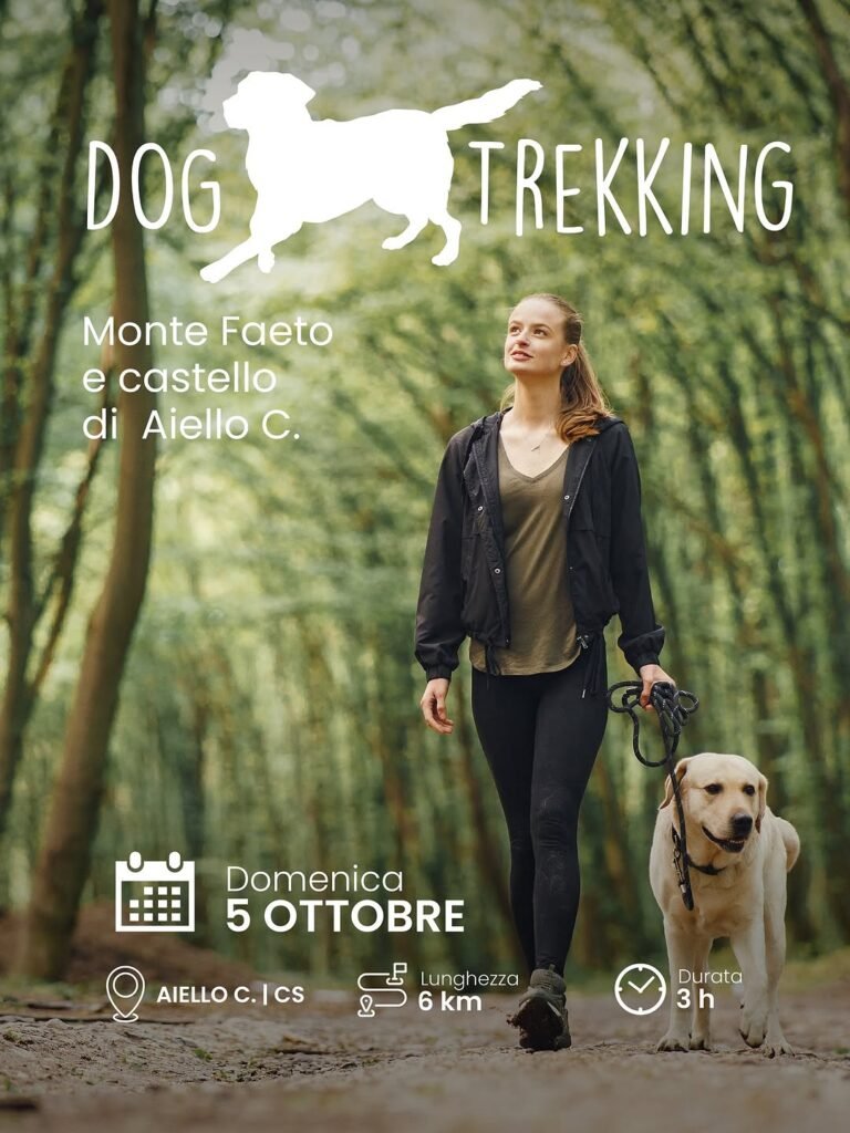 Il 5 ottobre ad Aiello Calabro (CS) è in programma un dog trekking (un'esperienza trekking con il proprio cane) che condurrà i partecipanti lungo i sentieri di Monte Faeto, con tappa al Castello Normanno del borgo.