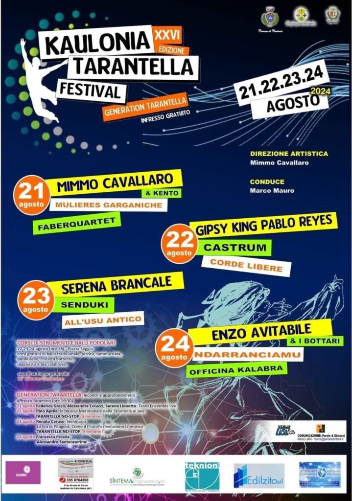 Dal 21 al 24 agosto, l’incantevole borgo di Caulonia si trasforma nel cuore pulsante della musica popolare calabrese, ospitando la 26ª edizione del Kaulonia Tarantella Festival. Quattro giorni di pura energia, dove tradizione e innovazione si fondono in un’esplosione di suoni e danze coinvolgenti.