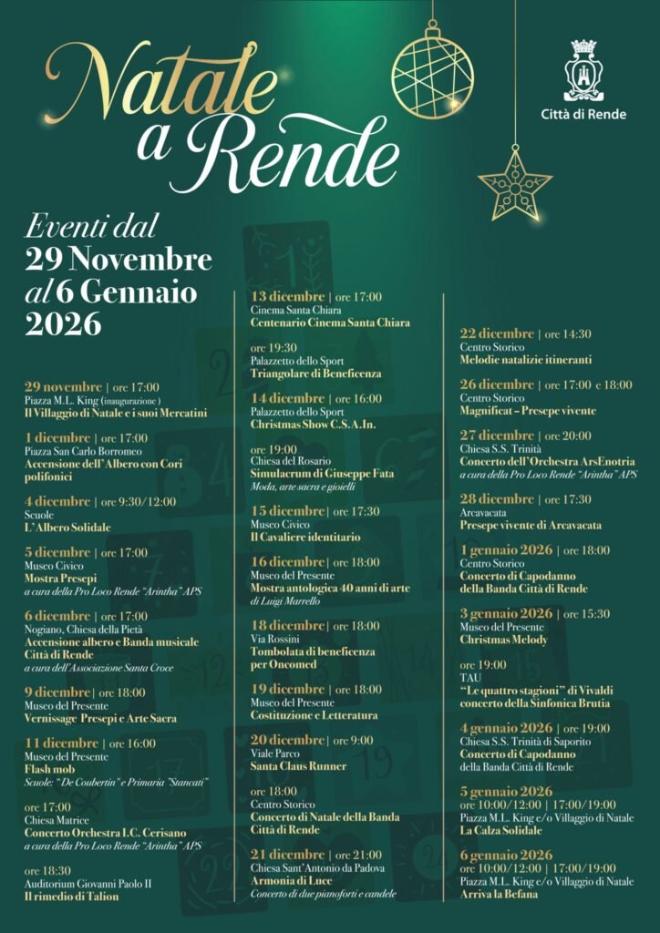 Dal 29 novembre 2025 al 6 gennaio 2026, Rende (CS) propone un calendario di iniziative per il periodo natalizio, con mercatini, stand artigianali ed enogastronomici, concerti, spettacoli e attività pensate per adulti e bambini.