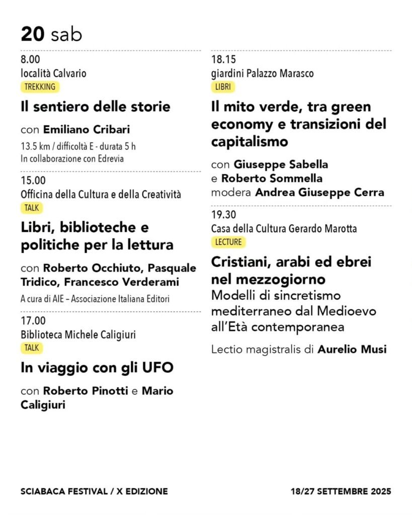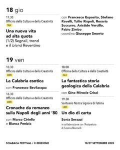 Torna a Soveria Mannelli (CZ) la decima edizione dello Sciabaca Festival, l’evento che celebra le culture mediterranee attraverso incontri, libri, musica e tradizioni locali. Dal 18 al 27 settembre 2025, il centro della Calabria ospiterà talk con autori, trekking narrativo, degustazioni, mostre e performance musicali, offrendo un’occasione unica per esplorare storie e sapori del territorio.